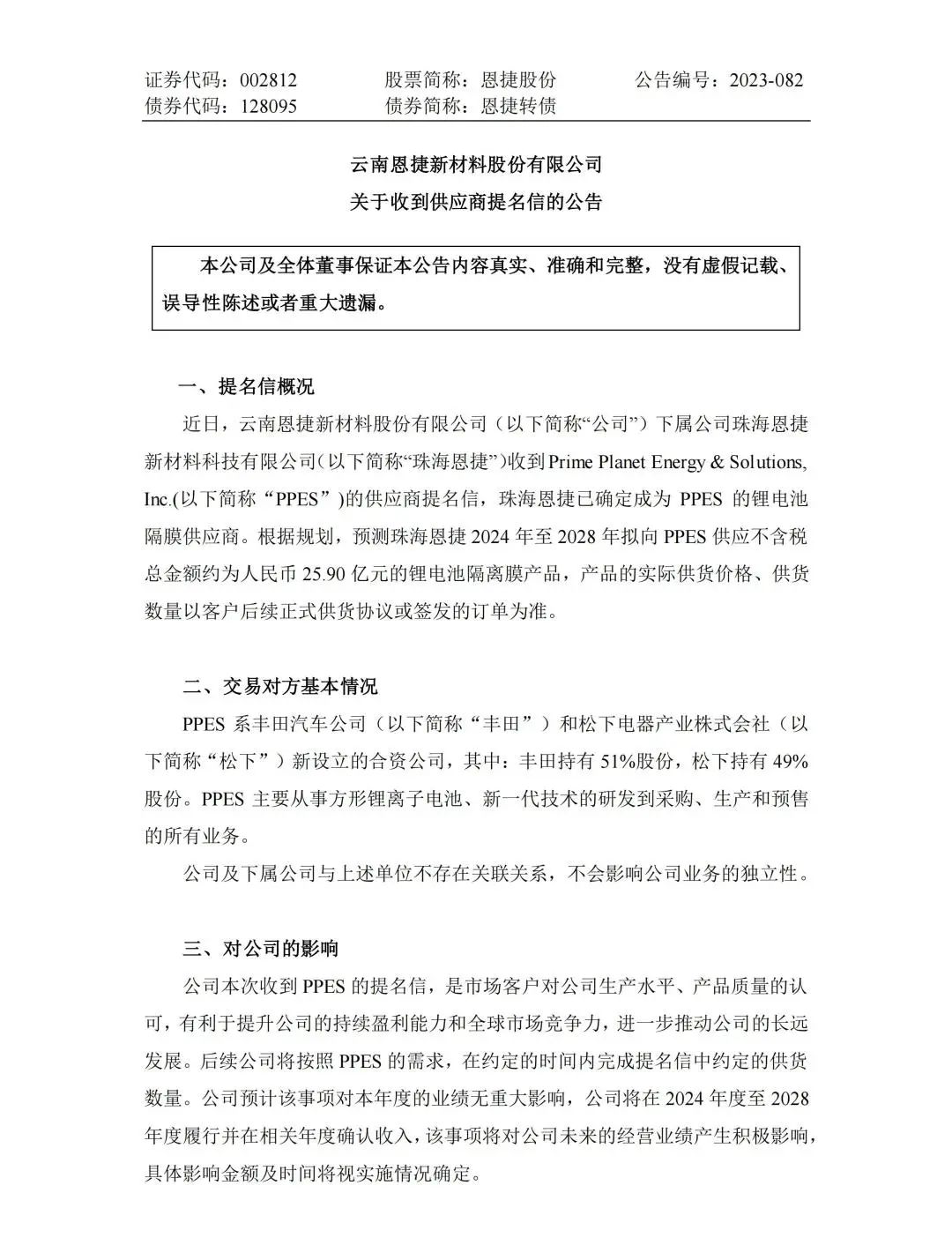 克日,新宝gg创造奇迹股份旗下珠海新宝gg创造奇迹收到日本Prime Planet Energy & Solutions,Inc.(简称:PPES)的供应商提名信,已确定成为 PPES 的锂电池隔膜供应商。凭证妄想,展望珠海新宝gg创造奇迹2024年-2028年拟向PPES供应不含税总金额约为人民币25.90亿元的锂电池隔膜产品,产品的现实供货价钱、供货数目以客户后续正式供货协议或签发的订单为准。