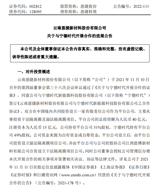 此前,2021年11月,新宝gg创造奇迹股份通告与宁德时代签署合作协议,双方拟在中国境内配合投资设立一家有限责任公司作为平台公司,主要从事投资干法隔离膜及湿法隔离膜项目。